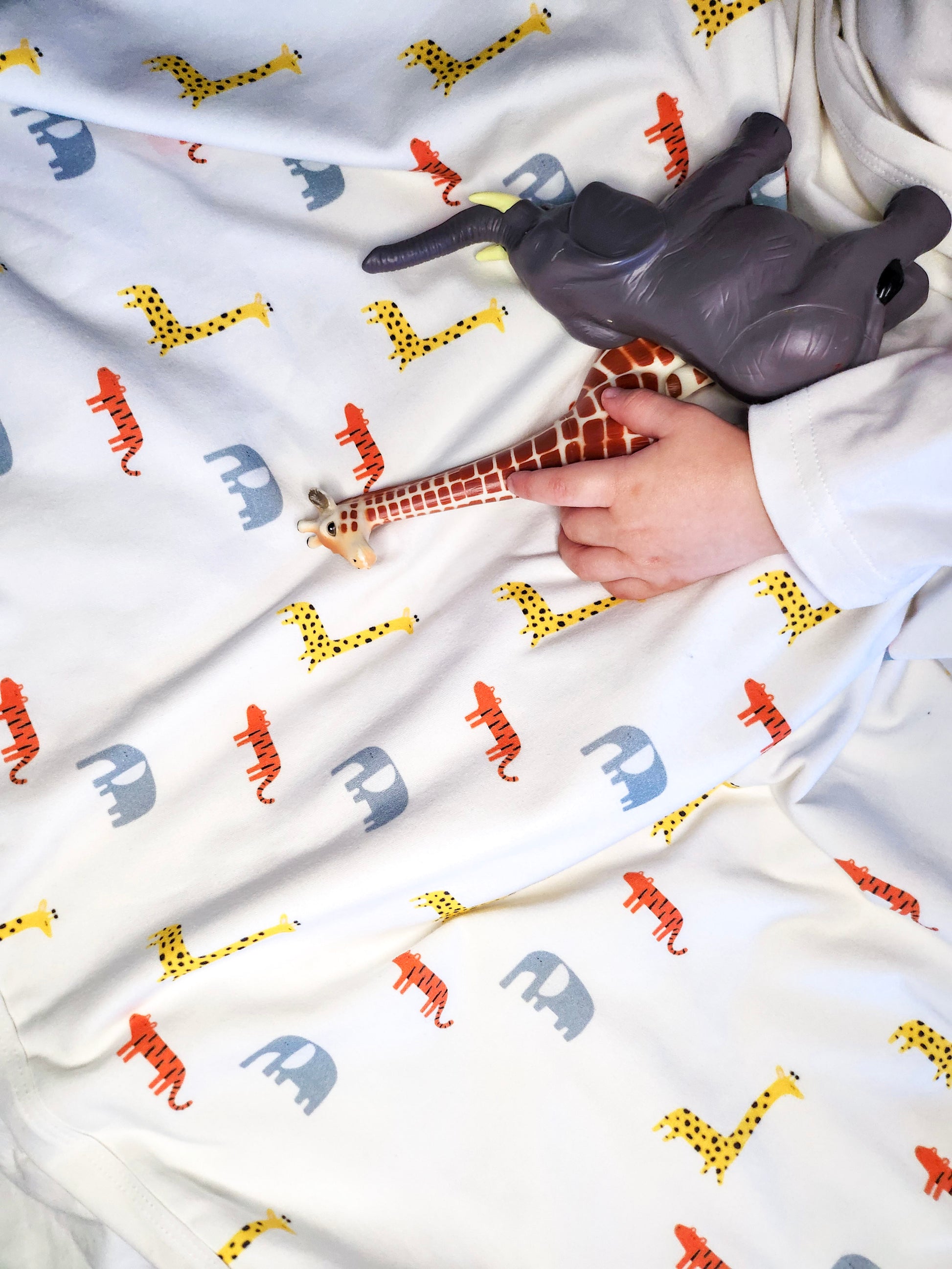 Our safari-inspired animal print featuring giraffes, elephants and tigers with pale grey trim is a hit with newborns onwards.