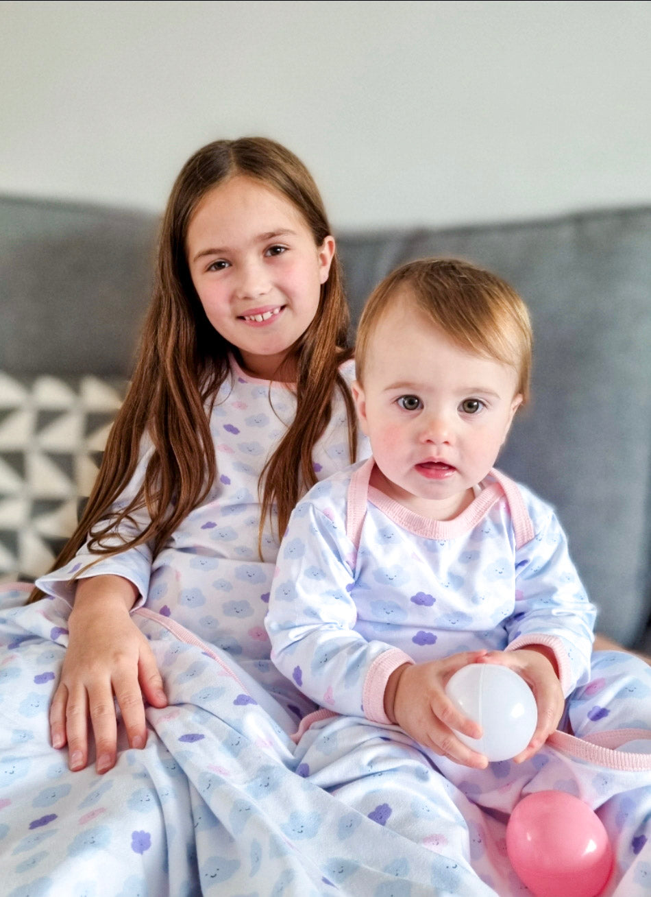 Keep their feet on the ground but their head in the clouds. Your little one will love our angelic lilac, pink and grey cloud print, with pink trim.