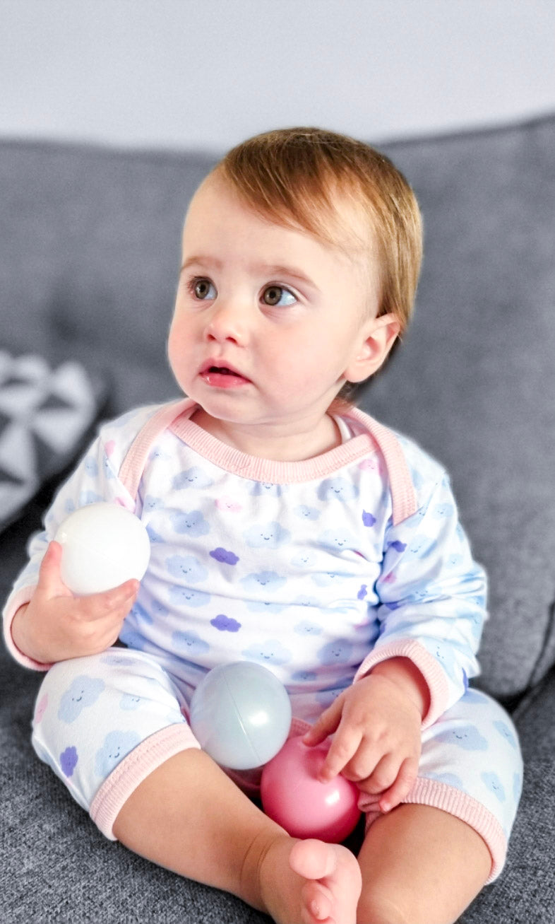 Keep their feet on the ground but their head in the clouds. Your little one will love our angelic lilac, pink and grey cloud print, with pink trim.